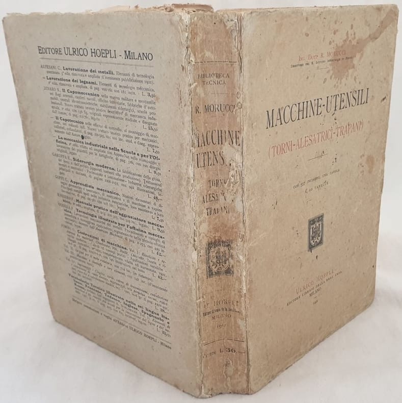 Manuale Hoepli del 1921 sulle macchine utensili (torni, alesatrici ee trapani) del Dott. R. Morucci. All'interno 557 incisioni, una tavola ripiegata e alcune tabelle. In buone condizioni. Copertina editoriale in discrete condizioni con usure marginali. Macchie. Legatura in buone condizioni. Pagine in buone condizioni. In 8. Dim. 24x17 cm. Pp. XIV+(2)+510. Hoepli manual of 1921 sulle about tool machinery (tower, reamer and drill) by Dott. R. Morucci. Inside 557 engravings, a folded plate and some charts. In good conditions. Editorial cover in fair conditions lightly worn in the extremities. Stains. Binding in good conditions. Pages in good conditions. In 8. Dim. 24x17 cm. Pp. XIV+(2)+510.