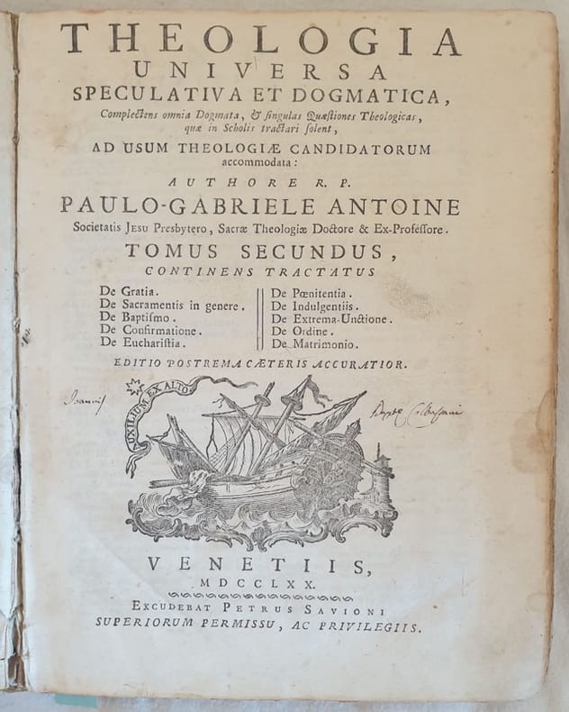 Edizione del 1770 di questa celebre e fortunata opera teologica del gesuita e teologo francese Paule Gabriel Antoine (1679-1743). Pubblicata per la prima volta nel 1726, la sua "Theologia moralis" fu cosi apprezzata che Benedetto XIV decise di utilizzarla come testo per gli studenti del Collegio della Propaganda.<BR>A partire dal 1747 nella sua teologia vennero inserite anche proposizioni condannate, casi riservati e decreti di Benedetto XIV. Secondo l'opinione di Gury e Liguori Antoine mostrava un atteggiamento troppo severo. All'interno numerosi trattati: Grazia, Sacramenti, Indulgenze, Sacramento dell'estrema unzione, Sacramento dell'ordine, del matrimonio ecc... L'opera era composta da due volumi, siamo in possesso del secondo tomo solamente. Opera completa di tutte le pagine. Antiche note manoscritte. In buone condizioni. Copertina in piena pergamena coeva con titolo manoscritto al dorso in discrete condizioni generali con usure e parti mancanti ai margini, piatti e dorso. Legatura in discrete condizioni con lievi rotture. All'interno le pagine si presentano in buone condizioni con fioriture. In 8. Dim. 23,5x18,5 cm. Pp. VIII+372. Edition of 1770 of this famous and lucky theological work written by the french theologist and jesuit Paule Gabriel Antoine (1679-1743). Published for the first time in 1726, his "Theologia moralis" was so appreciated that Benedetto XIV decided to use it as text for the students of College of Propaganda.<BR>From 1747 in his theology were put also condamned propositions, reserved cases and propositions of Benedetto XIV. According to the opinion of Gury and Liguori Antoine showed an excessively severe behaviour. Different treaties inside: Grazia, Sacraments, Indulgences, Sacrament of extreme unction, Sacrament of the order, marriage etc... Work complete of all pages. the work was made up of two volumes, we only have the second tome. Antique handwritten notes. In good conditions. Full parchment coeval cover with handwritten title in the spine in fair general conditions lightly worn in the extremities. Binding in fair conditions with light cracks. Inside pages are in good conditions with foxing. In 8. Dim. 23,5x18,5 cm. Pp. VIII+372.