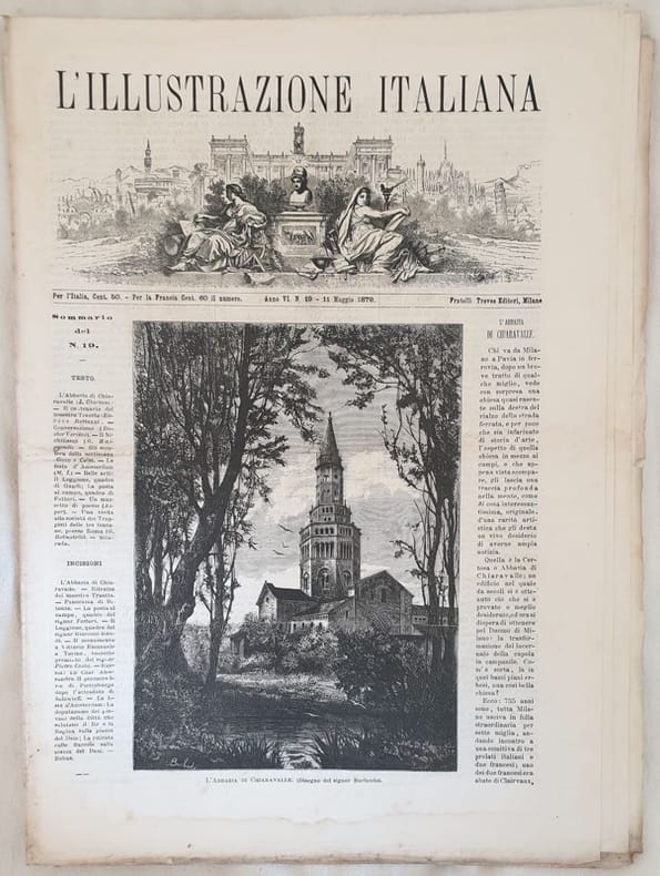 Numero del 11 maggio 1879 dell'Illustrazione italiana. Il volume in folio è riccamente illustrato da incisioni nel testo e fuori testo. All'interno: L'Abbazia di Chiaravalle, Il Centenario del Maestro Traetta, Le feste di Amsterdam,La Posta di Campo quadro di Fattori, Le feste di Amsterdam, Una visita alla Societa agricola dei trappisti delle tre fontane presso Roma Le incisioni: L'Abbazia di Chiaravalle, Il Maestro Traetta, Bitonto, La Posta di Campo quadro di Fattori, Il monumento a Vittorio Emanuele a Torino, Il Loggione quadro, Russia San Pietroburgo, Le feste di Amsterdam ecc... In buone condizioni. Copertina editoriale in buone condizioni con lievi usure ai margini e dorso. Legatura editorialmente assente. Pagine in buone condizioni con fioriture. Piegatura orizzontale. In folio cm 38,5x28,5. Pp. da 199 a 304Number of 11st of may 1879 of Illustrazione italiana. The volume in folio is richly illustrated by engravings in the text and out of text. Inside: The Abbey of Chiaravalle, Hundred years of Maestro Traetta, Feasts of Amsterdam,La Posta di Campo painting of Fattori, Feasts of Amsterdam, A visit to Societa agricola dei trappisti delle tre fontane near Roma The prints: Queen Vittoria in Baveno, Royal Palace of Caserta, Three fountains near Rome, Pietroburgo, Along the Coasts of Norway ecc... In good conditions. Editorial cover in good conditions lightly won in the extremities. Binding editoriarly lacks. Pages are in good conditions with foxing. Horizontal folding. In folio cm 38,5x27,5. Pp. from 199 to 304