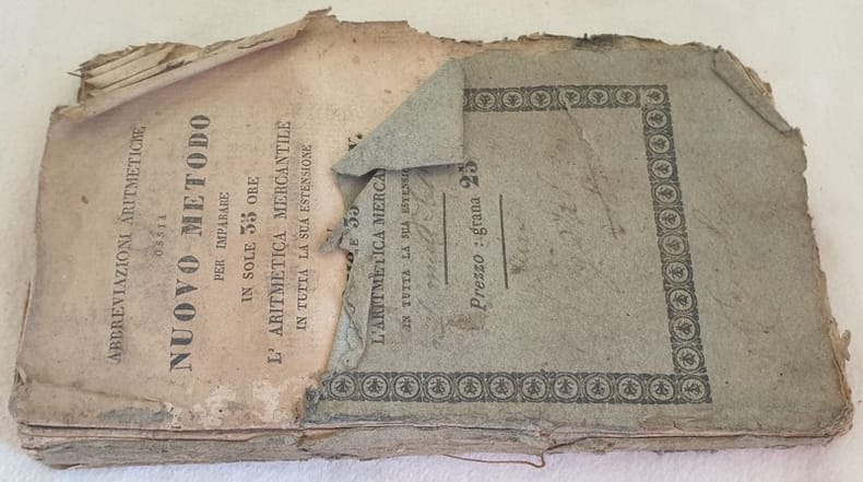 Edizione del 1830 di questo manuale per la marina mercantile, un metodo di abbreviazioni aritmetiche per l'aritmetica mercantile a cura di Giacomo Boggiany. In mediocri condizioni. Copertina editoriale in mediocri condizioni con usure ai margini e dorso. Piatto anteriore a metà e posteriore assente. Legatura in discrete condizioni con rotture. All'interno le pagine si presentano in mediocri condizioni con fioriture, gore d'umidità e segni di sporco da pag. 114 alla fine. Foro all'ultima pagina 115. Parte mancante all'angolo inferiore destro. In 16. Dim. 18x11 cm. Pp. 116. Edition of 1830 of this manual for merchant marine, a method of arythmetics abrbeviations by Giacomo Boggiany. In poor conditions. Editorial cover in poor conditions with wearings in the extremities. Front plate cut into two parts and back plate lacks. Binding in fair conditions with cracks. Inside pages are in poor conditions with foxing, dump stains and dirt signs from pag. 114 until the end. Hole in the last page 115. Lacking in the lower right corner. In 16. Dim. 18x11 cm. Pp. 116.
