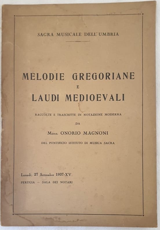 Interessante pubblicazione del 1937, partiture di melodie gregoriane e laudi medioevali raccolte e trascritte da Mons. Onorio Magnoni. All'interno: Antiche melopee liturgiche (Viri Galilaei, Alleluja, Christus factus est, Dicit Dominus, Jubilate Deo, Crux fidelis), Canti Medioevali (Kyrie, Victimae paschali laudes, In Natali domini, Puer natus in Bethlehem, O Virgo Pulcherrima, O spes mea cara, Gloria sanctorum, Ubi charitas et amor Deus ibi est, Concordi laetitia) Laudi italiche in volgare (Alta trinita beata, Laudamo la resurrectione, Veniter a laudare, Laude novella, Martir glorioso aulente flore, Laudar vollio,), Laudes seu acclamationes juxta antiquum morem (Laudes seu acclamationes) In discrete condizioni Copertina editoriale in discrete condizioni con usure ai margini e dorso. Gore di umidità. Legatura in buone condizioni. Pagine in buone condizioni con rare fioriture. Gore d'umidità marginali. In 8. cm 24,5x17. Pp. (6)+24+(3) Interesting pamphlet of 1937, gregorian melodies and medieval laudi colelcted and written by Mons. Onorio Magnoni. Inside: Antiche melopee liturgiche (Viri Galilaei, Alleluja, Christus factus est, Dicit Dominus, Jubilate Deo, Crux fidelis), Canti Medioevali (Kyrie, Victimae paschali laudes, In Natali domini, Puer natus in Bethlehem, O Virgo Pulcherrima, O spes mea cara, Gloria sanctorum, Ubi charitas et amor Deus ibi est, Concordi laetitia) Laudi italiche in volgare (Alta trinita beata, Laudamo la resurrectione, Veniter a laudare, Laude novella, Martir glorioso aulente flore, Laudar vollio,), Laudes seu acclamationes juxta antiquum morem (Laudes seu acclamationes) In good conditions. Editorial cover in fair conditions lightly worn in the extremities. Dump stains. Binding in good conditions. Pages in good conditions with occasional foxing. Dump stains in the extremities. In 8. cm 24,5x17. Pp. (6)+24+(3).
