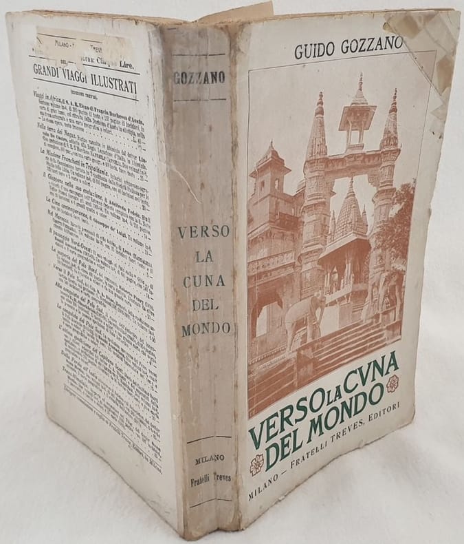 Edizione del 1920 di questa opera di viaggi del poeta e scrittore italiano Guido Gozzano (1883-1916). Prefazione di G. A. Borgese. Ritratto in antiporta. All'interno: Le grotte delle Trimurti, Goa, Un Natale a Ceylon, Da Ceylon a Madura, Golconda, Agra, Fachiri e ciurmadori, Jaipur, Cawnepore ecc... In buone condizioni. Copertina editoriale con sovracoperta in discrete condizioni generali con lievi usure marginali. Legatura in discrete condizioni con lievi rotture. All'interno le pagine si presentano in ottime condizioni con rare fioriture. In 8. 19,5x13 cm. Pp. XV+264+(1) Edition of 1920 of this work of travel by the italian poet and writer Guido Gozzano (1883-1916). Prefation by G. A. Borgese. Portrait in the frontspice Inside: Trimurti, Goa, Ceylon, from ceylon to Madura, Golconda, Agra, Fachiri e ciurmadori, Jaipur, Cawnepore ecc... In good conditions. Editorial cover with dustjacket in fair general conditions lightly worn in the extremities. Binding in fair conditions with light cracks. Inside pages are in very conditions with occasional foxing. In 8. 19,5x13 cm. Pp. XV+264+(1)