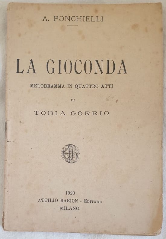 Bel libretto d'opera del 1920 edito da Barion. L'opera "La Gioconda" è di Amilcare Ponchielli su libretto di Arrigo Boito (firmato sotto lo pesudonimo e anagramma di Tobia Gorrio). Bella brossura editoriale. In discrete condizioni. Brossura editoriale in buone condizioni generali con lievi usure ai margini e dorso. Legatura in buone condizioni. All'interno le pagine si presentano in buone condizioni con rare fioriture. In 16 cm 18x12,5. Pp. 32