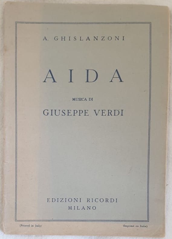 Edizione del 1945 del libretto d'opera Aida di Giuseppe Verdi (1813-1901) su libretto di Antonio Ghislanzoni. L'opera venne rappresentata per la prima volta il 24 dicembre 1871 al Cairo, Teatro dell'Opera. In buone condizioni. Copertina editoriale in buone condizioni generali con lievi usure ai margini e dorso. Legatura in buone condizioni. All'interno le pagine si presentano in buone condizioni con rare fioriture. In 8. Dim. 19,5x13,5 cm. Pp. 30.