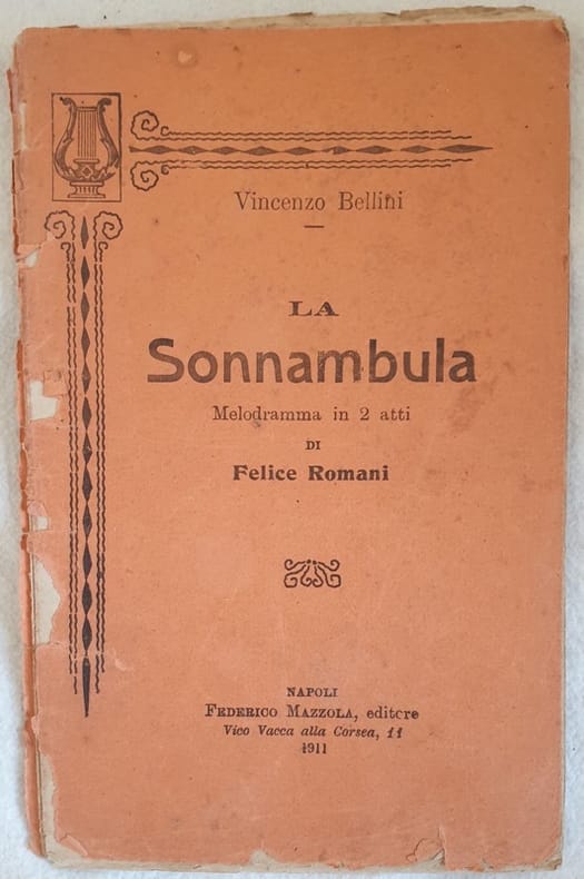 Bel libretto d'opera del 1911 dell'opera in due atti "La sonnambula" del compositore italiano Vincenzo Bellini (1801-1835) su libretto di Felice Romani. La prima rappresentazione ebbe luogo al Teatro Carcano di Milano il 6 marzo 1831. In discrete condizioni. Brossura editoriale in discrete condizioni generali con usure ai margini e dorso. Piatti staccati. Legatura in buone condizioni. All'interno le pagine si presentano in ottime condizioni con rare fioriture. In 16. Dim. 18,5x12 cm. Pp. 24.