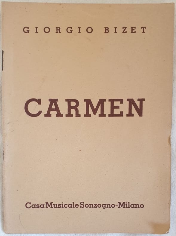 In 16. Dim. 18,5x14 cm. Pp. 48. Edizione del 1937 del libretto d'opera Carmen di George Bizet (1838-1875). L'opera venne rappresentata per la prima volta il 3 marzo 1875 dell'Opera Comique di Parigi.<BR>In ottime condizioni. Copertina editoriale in ottime condizioni generali con lievi usure ai margini e dorso. Legatura in buone condizioni. All'interno le pagine si presentano in ottime condizioni con rare fioriture. Edition of 1937 of this booklet Carmen by George Bizet (1838-1875). The work was represented for the first time the 3rd of march 1875 of the Opera Comique of Paris.<BR>In very good conditions. Editorial cover in good general conditions slightly worn in the edges and spine. Binding in good conditions. Inside pages are in good conditions with occasional foxings.