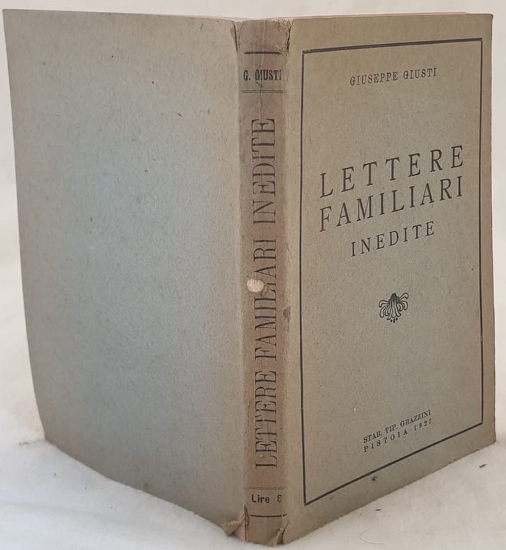 Edizione del 1927 di questa raccolta di lettere familiari inedite di Giuseppe Giusti (1809-1850), la cui fama resta affidata a componimenti di carattere polemico, satirico, vivace.<BR>In buone condizioni Brossura editoriale in buone condizioni generali con lievi usure ai margini e dorso. Parte mancante al dorso. Legatura in buone condizioni. All'interno le pagine si presentano in ottime condizioni con rare fioriture. In 8. Dim. 20x13 cm. Pp. 319+(1).Edition of 1927 of this collection of inedit familiar letters by Giuseppe Giusti (1809-1850), famous for his polemics and funny poems.<BR>The work is in one volume and it is complete. In good conditions. Editorial cover in good general conditions slightly worn in the edges and spine. Missing part in the spine. Binding in good conditions. Inside pages are in very good conditions with occasional foxings. In 8. Dim. 20x13 cm. Pp. 319+(1).