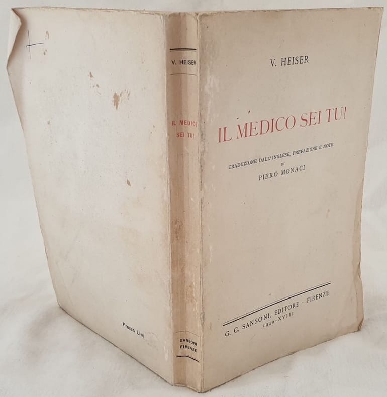 Edizione del 1940 di questa opera di medicina popolare di V. Heiser. Traduzione dall'inglese prefazione e note di Piero Monaci. All'interno: Dimmi che cosa mangi..., le vitamine fonte di salute, nostro fratelli il ratto, cum grano salis, come va, mucca bruna?, il valore dell'acqua, un po di veleno ogni tanto, la prova del budino, , cuore polmoni e ginnastica, se la scarpa va bene, il termostato umano, il volgare raffreddore, il letto e il sonno, il riso fa buon sangue ecc... In buone condizioni. Copertina editoriale in buone condizioni generali con lievi usure ai margini e dorso. Legatura in buone condizioni. All'interno le pagine si presentano in ottime condizioni con rare fioriture. In 8. Dim. 23x15 cm. Pp. 303+(5). Edition of 1940 of this work of popular medicine by V. Heiser. Translation from english with prefation and notes by Piero Monaci. In good conditions. Editorial cover in good general conditions lightly worn in the extremities. Binding in good conditions. Pages in very good conditions with occasional foxing. In 8. Dim. 23x15 cm. Pp. 303+(5). <BR><BR>