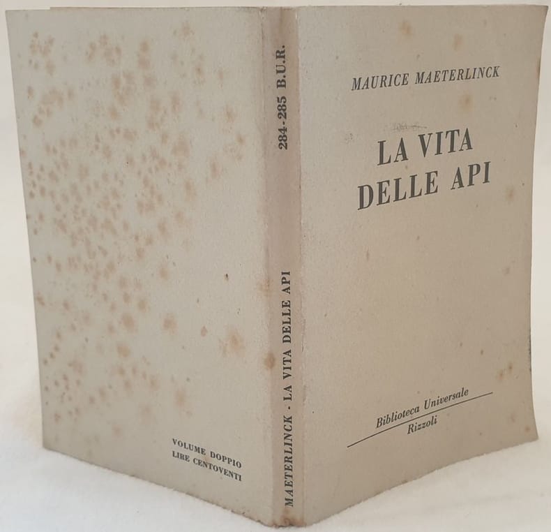 Edizione Bur del 1951 di questa opera di divulgazione scientifica di Maurice Maeterlinck. Quest'opera unisce un linguaggio divulgativo al rigore scientifico e descrive la vita delle api. All'interno: sulla soglia dell'alveare, lo sciame, La fondazione della città, Le giovani regine, Il volo nuziale, Il massacro dei maschi, Il progresso della specie. In buone condizioni. Copertina editoriale in buone condizioni generali con lievi usure ai margini e dorso. Legatura in buone condizioni. All'interno le pagine si presentano in buone condizioni con fioriture. Usure all'angolo superiore destro delle prime 12 pagine. In 16. Dim. 15,5x10,5 cm. Pp. 186+(6). Bur edition of 1951 of this work of scientiphic divulgation by Maurice Maeterlinck. This work blends a divulgative language to science and describes the life of bees. In good conditions. Editorial cover in good general conditions lightly worn in the extremities. Binding in good conditions. Pages in good conditions with foxing. Wearings in the upper right corner of the first 12 pages. In 16. Dim. 15,5x10,5 cm. Pp. 186+(6).
