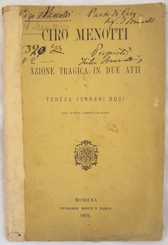 Edizione del 1879 del dramma "Ciro Menotti" di Teresa Ferrari Bosi. Note manoscritte in copertina. Allinterno appunti manoscritti sulla sistemazione delle scene e attori. Brossura editoriale originale. In buone condizioni. Copertina morbida in discrete condizioni generali con lievi usure ai margini e dorso. Dorso coperto da carta. Legatura in buone condizioni. All'interno le pagine si presentano in buone condizioni con fioriture. In 16. 16,5x11 cm. Pp. 32.Edition of 1879 of the drama "Ciro Menotti" by Teresa Ferrari Bosi. Handwritten notes in the cover. Editorial original cover. In good conditions. Soft cover in fair general conditions lightly worn in the extremities. Spine covered by paper. Binding in good conditions. Inside pages are in good conditions with foxing. In 16. 16,5x11 cm. Pp. 32.