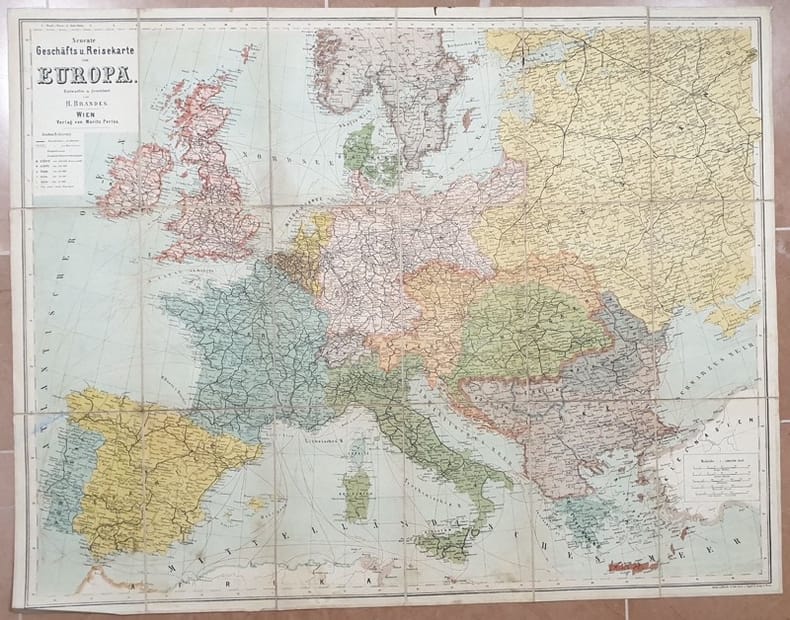 Bella mappa telata di inizio novecento dell'Europa pubblicata da H. Brandes. Di grandi dimensioni. AUTORE: H. Brandes DIMENSIONI FOGLIO: 790x620 mm DIMENSIONI INCISIONE: 785x610 mm EPOCA: inizio novecento CONDIZIONI: buone condizioni. Beautiful cloth map of early 20th century of Europe published by H. Brandes. Of big size AUTHOR: H. Brandes LEAF DIMENSION: 790x620 mm ENGRAVING DIMENSION: 785x610 mm DATE: early 20th century CONDITIONS: Very good conditions.