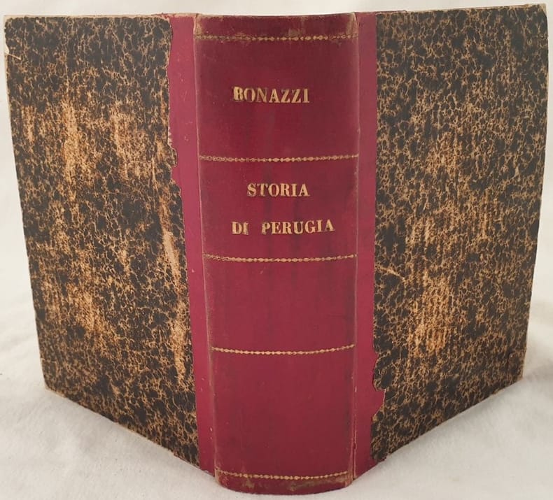 Edizione originale del 1875 della celebre e discussa opera storia su Peugia di Luigi Bonazzi. "Ediz. esaurita e molto stimata. Il Bonazzinel 1871 aveva pubblicato pei tipi Santucci di Perugia un 1° volume comprendente la parte antica, che poi esso stesso mandò in giro per la città... Siccome era assai maledico e tutti temevano la sua lingua, così nessuno quasirifiutò ed ei si fece un bel gruzzolo. Incoraggiato dal successo manifestò il suointendimento di voler rifondere quel primo vol.... portanto la storia fino ai tempi nostri. Era maestro di storia al liceo ed ottenne dal Comune di essere esonerato dalla scuola per iscrivere la storiadi Perugia... Così fuche pubblicò il 1° vol. e poi il 2° che sono quelli descritti... di improntalquanto originale e, malgrado le esagerazioni in bene o in male e più in questo che quello, non manca di pregio." Lozzi 3449. L'opera è formata da due tomi legati insieme ed è completa. In buone condizioni. Copertina in mezza pelle coeva con titolo e decorazioni in oro al dorso in buone condizioni con lievi usure marginali. Legatura in buone condizioni ma frontespizio del primo tomo in parte staccato. Pagine in buone condizioni con rare fioriture. In 8. Dim. 24,5x17,5 cm. Pp. 798+(2)+798+(2). Peso Kg. 1,7Original edition of 1875 of the famous and discussed work of history about Peugia by Luigi Bonazzi. "Ediz. esaurita e molto stimata. Il Bonazzinel 1871 aveva pubblicato pei tipi Santucci di Perugia un 1° volume comprendente la parte antica, che poi esso stesso mandò in giro per la città... Siccome era assai maledico e tutti temevano la sua lingua, così nessuno quasirifiutò ed ei si fece un bel gruzzolo. Incoraggiato dal successo manifestò il suointendimento di voler rifondere quel primo vol.... portanto la storia fino ai tempi nostri. Era maestro di storia al liceo ed ottenne dal Comune di essere esonerato dalla scuola per iscrivere la storiadi Perugia... Così fuche pubblicò il 1° vol. e poi il 2° che sono quelli descritti... di improntalquanto originale e, malgrado le esagerazioni in bene o in male e più in questo che quello, non manca di pregio." Lozzi 3449. The work is amde up of two toms bound together and it is complete. In good conditions., In good conditions. Half leather coeval cover with gilted title and decorations in the spine in good conditions lightly worn in the extremities. Binding in good conditions but title page of the first tome detached. Inside pages are in good conditions with occasional foxing. In 8. Dim. 24,5x17,5 cm. Pp. 798+(2)+798+(2). Weight Kg. 1,7