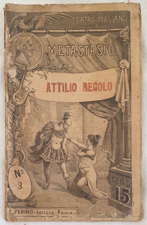 Edizione del 1891 della serie Teatro italiano del melodrammo "Attilio Regolo" del poeta, librettista, drammaturgo Pietro Metastasio (1698-1782) pseudonimo di Pietro Antonio Domenico Bonaventura Trapassi. All'interno sono presenti due planches. Brossura editoriale. In buone condizioni. Brossura editoriale in discrete condizioni generali con lievi usure ai margini e dorso Legatura quasi assente. All'interno le pagine si presentano in buone condizioni con rare fioriture. In 16. 17,5x11 cm. Pp. 64. Edition of 1891 of the series Teatro italiano of this drama by the poet, booklet writer, dramawriter Pietro Metastasio (1698-1782) pseudonymous of Pietro Antonio Domenico Bonaventura Trapassi. Inside there are two plates. In good conditions. Editorial cover in fair general conditions lightly worn in the extremities. Binding almost lacks. Inside pages are in good conditions with occasional foxing. In 16. 17,5x11 cm. Pp. 64.