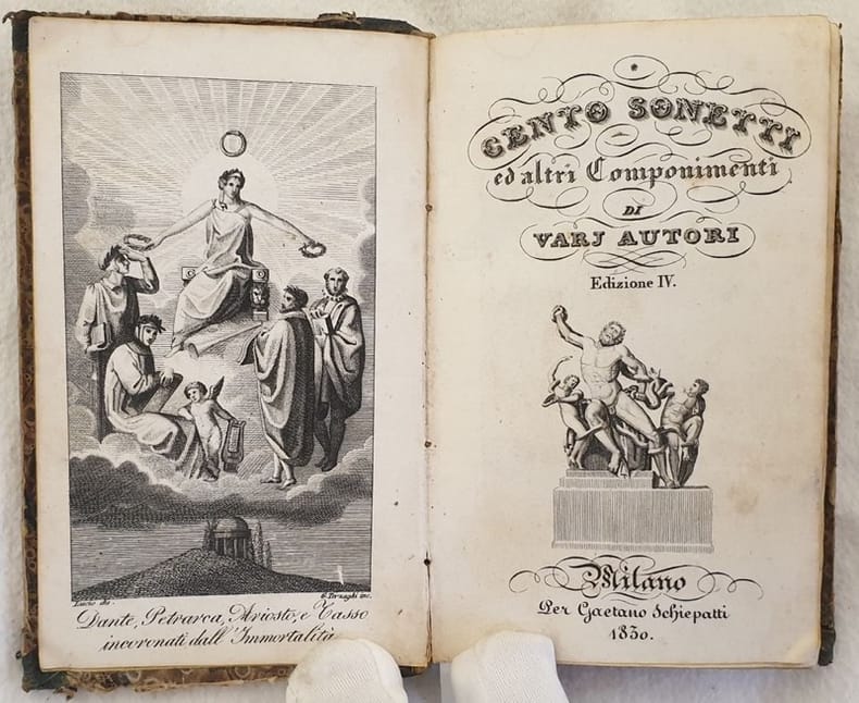 Edizione del 1830 di questa raccolta di sonetti di vari autori. Alcune poesie e un saggio sulla filosofia del gusto di Melchior Cesarotti (1730-1808), opera di estetica.Incisione in antiporta di Terzaghi su disegno di Lucio. All'interno sonetti, Canti sul Ss. Natale di Gaudenzi, novella di Parini, Sciolti di Mascheroni, Cantica di Perticari, Inni di Borghi, Discorso di Cesarotti. Antica firma datata 1865 alla prima carta bianca. In buone condizion Copertina in mezza pelle coeva con titolo in oro al dorso in buone condizioni generali con lievi usure marginali. Segni di tarlo. Legatura in buone condizioni. Pagine in buone condizioni con fioriture. In 24. cm 13x8,5. Pp. 276.Edition of 1830 of this collection of sonnets of different authors. Some poems and an essay about phylosophy of taste by Melchior Cesarotti (1730-1808), work of aestetics. Engraving in the frontspice of Terzaghi after Lucio. Inside sonnets, Chants of Christmas by Gaudenzi, short novel by Parini, Sciolti di Mascheroni, Cantica di Perticari, Inni di Borghi, Discorso di Cesarotti. Antique signature dated 1865 in the first endpage. In good conditions. Half leather coeval cover with gilted titlein good general conditions lightly worn in the extremities. Worming. Binding in good conditions. Inside pages are in good conditions with foxing. In 24. cm 13x8,5. Pp. 276