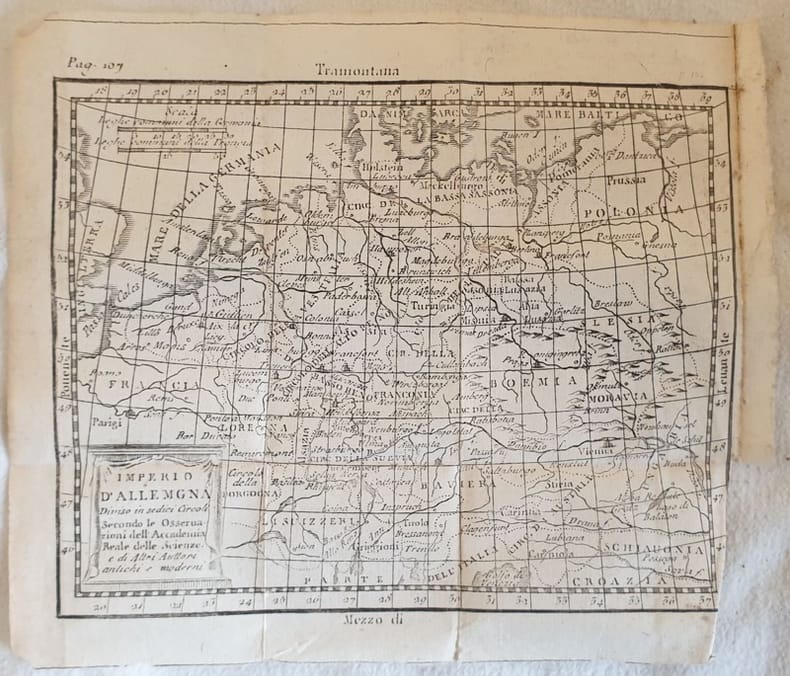 Graziosa mappa del 1750 circa dell'Impero di Germania (Polonia, Boemia, Moravia, Germania, Svizzera, Austria). Indicazione di monti e laghi. ATLANTE: Geografia universale - Buffier DIMENSIONI FOGLIO: cm 20x17 DIMENSIONI INCISIONE: cm 18x14,5<BR>EPOCA: 1750 circa CONDIZIONI: Ottime. Piegature. Nice map of 1750 circa of Germany (Poland, Boemia, Moravia, Germany Switzerland, Austria). Indications of mountains and lakes. ATLAS: Geografia universale - Buffier LEAF DIMENSION: cm 20x17<BR>ENGRAVING DIMENSION: cm 18x14,5<BR> DATE: 1750 circaCONDITIONS:Very good conditions. Foldings.