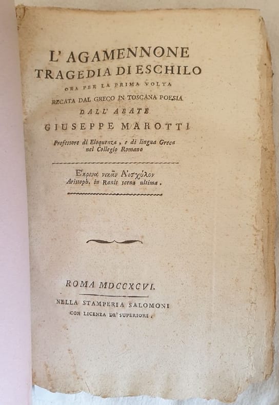 Edizione del 1796 della versione in volgare della tragedia di Eschilo "L'Agamennone". Traduzione a cura di Giuseppe Marotti (1741-1804) ex gesuita, segretario delle lettere latine di Pio VI e poi di Pio VII. Marotti tradusse anche Prometeo e i sette a Tebe. Le sue traduzioni godettero di notevole fortuna al tempo. In buone condizioni e completo. Copertina morbida moderna in buone condizioni generali. Legatura in buone condizioni. All'interno le pagine si presentano in buone condizioni con fioriture.In barbe. In 8. Dim. 22,5x15,5 cm. Pp. XII+59+(1).Edition of 1796 of the version in italian language by the tragedy by Eschilo "L'Agamennone". Translation by Giuseppe Marotti (1741-1804) ex jeesuit, segretary of the latin letters of Pio VI and Pio VII<BR>Marotti tarnslated also Prometeo e i sette a Tebe. His gtranslations had a great succes. In good conditions and complete. Soft modern cover in good conditions lightly worn in the extremities. Binding in good conditions. Pages in good conditions with foxing. Uncut copy. In 8. Dim. 22,5x15,5 cm. Pp. XII+59+(1).