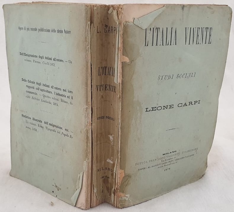 Interessante studio sociale del 1878 sull'Italia dell'economista politico e giornalista Leone Carpi (1810-1898). Alla fine "Delle donne illustri italiane del secolo XIX e più specialmente delle viventi". Tra gli argomenti trattati: Il Re, Pio IX, Giuseppe Garibaldi, Delle Aristocrazia, Indagini sulle classi alte in Italia (Calabria, Napoli, Bologna, Teramo, Sassari, Bergamo, Modena, Marche, Palermo, Venezia, REggio Calabria), Considerazioni caratteristiche e tipiche, La moralità in Italia, Clero alto e basso, Burocrazia, Educazione morale e sociale delle moltitudini ecc... Due tavole ripiegate: Censimento 1871, Provincie 1876. In discrete condizioni. Copertina editoriale in discrete condizioni generali con lievi usure marginali. Legatura in discrete condizioni con rotture. All'interno le pagine si presentano in buone condizioni con fioriture. In 8. 19x13 cm. Pp. 602+63.Interesting social study of 1878 about Italy by the economist politician by the journalist Leone Carpi (1810-1898). At the end "Delle donne illustri italiane del secolo XIX e più specialmente delle viventi". Between the issues treated: the King, Pio IX, Giuseppe Garibaldi, Delle Aristocrazia, Indagini sulle classi alte in Italia (Calabria, Napoli, Bologna, Teramo, Sassari, Bergamo, Modena, Marche, Palermo, Venezia, REggio Calabria), Considerazioni caratteristiche e tipiche, La moralità in Italia, Clero alto e basso, Burocrazia, Educazione morale e sociale delle moltitudini ecc... Two folded plates: Census 1871, Provincie 1876. In fair conditions. Editorial cover in fair conditions lightly worn in the extremities. Binding in fair conditions with cracks. Pages are in good conditions with foxing. In 8. 19x13 cm. Pp. 602+63.