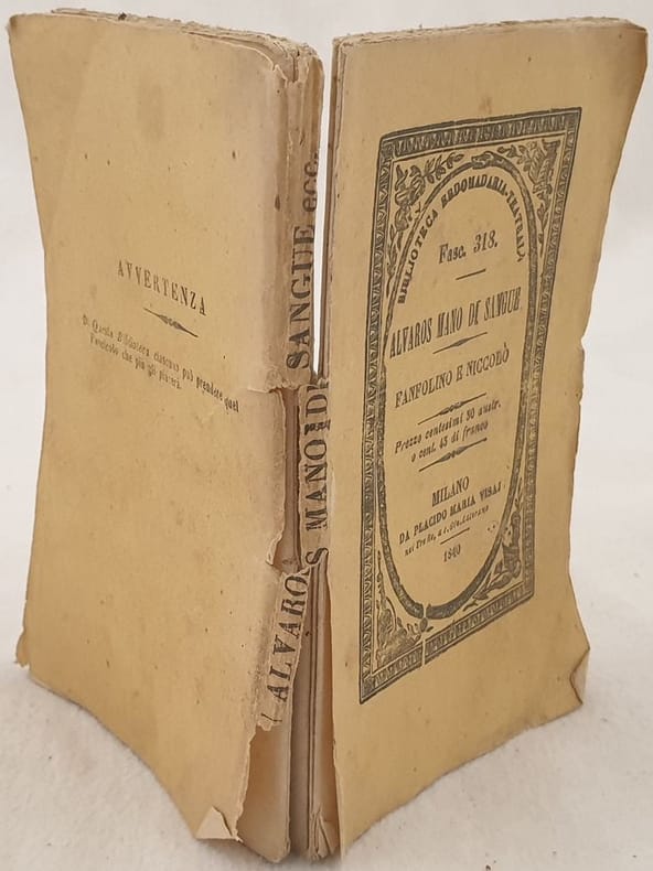 Edizione del 1840 di due commedie teatrali. La prima "Alvaros mano di sangue" e la seconda "Fanfolino e Niccolò". Note manoscritte. In discrete condizioni. Copertina editoriale in discrete condizioni generali con usure ai margini e dorso. Piatto posteriore staccato. Legatura in discrete condizioni con rotture. All'interno le pagine si presentano in buone condizioni con fioriture. In 16. 14,5x9,5 cm. Pp. 95.Edition of 1840 of of two theatre plays. The first one "Alvaros mano di sangue" and the second one "Fanfolino e Niccolò". Handwritten notes. Editorial original cover. In fair conditions. Editorial cover in fair general conditions lightly worn in the extremities. Back plate is detached. Binding in fair conditions with cracks. Inside pages are in good conditions with foxing. In 16. 14,5x9,5 cm. Pp. 95.