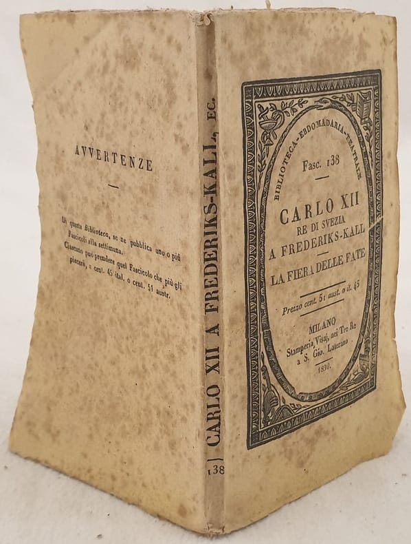 Edizione del 1830 di due commedie teatrali. La prima "Carlo XII Re di Svezia" e la seconda "La fiera delle fate". Note manoscritte. In buone condizioni. Copertina editoriale in buone condizioni generali con lievi usure ai margini e dorso. Legatura in buone condizioni. All'interno le pagine si presentano in buone condizioni con fioriture. In 16. 14,5x9,5 cm. Pp. 95.Edition of 1830 of of two theatre plays. The first one "Carlo XII Re di Svezia" and the second one "La fiera delle fate". Handwritten notes. Editorial original cover. In good conditions. Editorial cover in good general conditions lightly worn in the extremities. Binding in good conditions. Inside pages are in good conditions with foxing. In 16. 14,5x9,5 cm. Pp. 95.