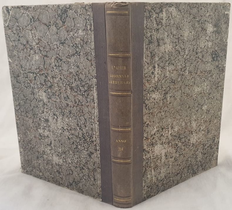 Annata completa dell'anno 1854 de l'Album di Roma, una rivista di letteratura, arte, viaggi e archeologia. Siamo in possesso del numero 1 del 25 febbraio 1854 fino al numero 52 del 17 febbraio 1855 All'interno: Il Carnevale, Descrizione della tela ove è dipinta l'immagine prodigiosa della Madonna di Sanginesio, Dipinture i casa Grassigli a Crevalcore, Catalopgo delle gemme incise dal Comemndatore Luigi Pichler, Magugnano villaggio del Viterbese, Sebastopoli, Chiesa della Madonna della Luce in Perugia, Antonio Rutilj, L'Isola Aland, La Certosa di Trisulti presso Alatri, Montino del Monte, Passaggio di Cimadoce vicino all'iosla di Cipro, L'Ercole di Prodico, Rocca della città di Cesena, la Biblioteca Piana, Angelo Mai, Mosaico di Gubbio, Chiesa sotterranea in Toscanella, L'ospedale delle sorelle della carità a Pera, Omeopatia, Il dialetto viterbese del Trecento, Cippo sepolcrale murato presso alla porta della Biblioteca della Università in Genova, Balaklava, I suggelli e le insegne di Viterbo, Ravenna, Moltissime incisioni di scene, ritratti e vedute tra cui: Il Castello di San Salvadore nel Friuli, Il mosaico prenestino, Sinope alle sponde del Mar Nero, Arco di Augusto nelle vicinanze di Capua, La crovifissione dipinto di Lorenzo Lotto, Facciata della Chiesa di San Giorgio a Bucarest, Mappa del Mar Baltico, Strade attraverso i Balcani alle frontiere di Bulgaria e Romelia, S. Agnese sulla Via Nomentana, Mappa di Kronstadt, Rocca Rispampani dell'Ospedale di S. Spirito in SAxia, Sebastopoli, Il vecchio Palazzo dei Priori in Tuscania, Rocca Rispampana, Chiesa della Madonna della Luce in Perugia, Antonio Rutil, L'isola Aland, La Certosa di Trisulti presso Alatri, Montino del Monte Rocca della città di Cesena, La biblioteca Piana, Mosaico di Gubbio, Il Ponte dell'Aricia, Cristoforo Colombo, L'ospedale delle sorelle della carità a Pera, La guerra in Crimea, Il vecchio Palazzo di giustizio a Madrid, Solenne consacrazione della Basilica Ostiense, Balaklava, Ravenna ecc... In buone condizioni. Copertina in mezza tela con titolo e decorazioni in oro al dorso in buone condizioni generali con lievi usure ai margini e dorso. Legatura in buone condizioni. All'interno le pagine si presentano in buone condizioni con rare fioriture. In 4. Dim. 30,5x23 cm. Pp. (8)+416. Complete collection of the year 1854 of Album di Roma, a magazine of literature, art traveks and archeology. We only havre the number 1 of 25th of february 1854 until the number 52 of the 17th of february 1855 Inside: Carnival, Painting of Madonna of Sanginesio, Painting in the house Grassigli in Crevalcore, Catalogue of jem engraved by Comemndatore Luigi Pichler, Magugnano villaggio del Viterbese, Sebastopoli, Church of Madonna della Luce in Perugia, Antonio Rutilj, the island Aland, Certosa di Trisulti near Alatri, Montino del Monte, Passaggio di Cimadoce vicino all'iosla di Cipro, L'Ercole di Prodico, Rocca della città di Cesena, la Biblioteca Piana, Angelo Mai, Mosaico di Gubbio, Chiesa sotterranea in Toscanella, L'ospedale delle sorelle della carità a Pera, Omeopatia, Il dialetto viterbese del Trecento, Cippo sepolcrale murato presso alla porta della Biblioteca della Università in Genova, Balaklava, I suggelli e le insegne di Viterbo, Ravenna, Many engravings of scenes, portariut and views between them: Il Castello di San Salvadore nel Friuli, Il mosaico prenestino, Sinope alle sponde del Mar Nero, Arco di Augusto nelle vicinanze di Capua, La crovifissione dipinto di Lorenzo Lotto, Facciata della Chiesa di San Giorgio a Bucarest, Mappa del Mar Baltico, Strade attraverso i Balcani alle frontiere di Bulgaria e Romelia, S. Agnese sulla Via Nomentana, Mappa di Kronstadt, Rocca Rispampani dell'Ospedale di S. Spirito in SAxia, Sebastopoli, Il vecchio Palazzo dei Priori in Tuscania, Rocca Rispampana, Chiesa della Madonna della Luce in Perugia, Antonio Rutil, L'isola Aland, La Certosa di Trisulti presso Alatri, Montino del Monte Rocca della città di Cesena, La biblioteca Piana, Mosaico di Gubbio, Il Ponte dell'Aricia, Cristoforo Colombo, L'ospedale delle sorelle della carità a Pera, La guerra in Crimea, Il vecchio Palazzo di giustizio a Madrid, Solenne consacrazione della Basilica Ostiense, Balaklava, Ravenna ecc... In good conditions. Half cloth cover with gilted title and decorations in the spine in good general conditions lightly worn in the extremities. Binding in good conditions. Inside pages are in good conditions with occasional foxing. In 4. Dim. 30,5x23 cm. Pp. (8)+416.<BR><BR>