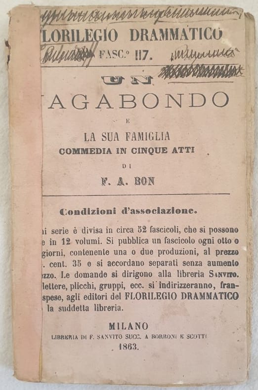 Bel libretto d'opera del 1863 dell'opera "Un vagabondo e la sua famiglia" del drammaturgo Francesco Augusto Bon (Peschiera del Garda 1788-Padova 1858).<BR>In discrete condizioni. Copertina editoriale con dorso coperto da carta in buone condizioni con lievi usure ai margini e dorso. Legatura in discrete condizioni con lievi rotture. All'interno le pagine si presentano in buone condizioni con fioriture. In 16. Dim. 15,5x10 cm. Pp. 80. Booklet of 1863 of the drama "Un vagabondo e la sua famiglia" by Francesco Augusto Bon (Peschiera del Garda 1788-Padova 1858) In fair conditions. Editorial cover with spine coverd by paper in good conditions lightly worn in the extremities. Binding in fair conditions with light cracks. Inside pages are in good conditions with foxing. In 16. Dim. 15,5x10 cm. Pp. 80.
