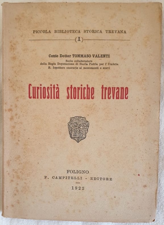 Interessante pubblicazione del 1922 sulla storia di Trevi di Tommaso Valenti della collana "Piccola biblioteca storica trevana". L'autore raccoglie una serie di curiosità su luoghi e fatti accaduti: La torre del Comune, la Piazza, il Palazzo del Municipio, le Mura, Porte di Trevi, Chiesa delle Lagrime, il Lago, Festa di sAnt'Emiliano, la dote e il corredo delle spose, la Torre di Matigge, Tre chiese devastate, uno storico di Trevi, Banditi e ladri, Ebrei a Trevi, Congregazioni delle arti, Oliveti ed olive, Chiesa di San Francescao, Armi ed armati, Un letterato a Trevi, Trevi e la Lega Santa ecc... In buone condizioni. Copertina editoriale in buone condizioni generali con lievi usure marginali. Legatura in buone condizioni. All'interno le pagine si presentano in ottime condizioni con rare fioriture. In 16. 18x13 cm. Pp. XV+160. Interesting pamphlet of 1922 about the history of Trevi by Tommaso Valenti of the series "Piccola biblioteca storica trevana". The author collects a series of curiosities and happenings In good conditions. Copertina editoriale in buone condizioni generali con lievi usure marginali. Legatura in buone condizioni. Interesting pamphlet of 1922 about the history of Trevi by Tommaso Valenti of the series "Piccola biblioteca storica trevana". The author collects a series of curiosities and happenings In good conditions. Copertina editoriale in buone condizioni generali con lievi usure marginali. Legatura in buone condizioni. All'interno le pagine si presentano in ottime condizioni con rare fioriture. In 16. 18x13 cm. Pp. XV+160.All'interno le pagine si presentano in ottime condizioni con rare fioriture. In 16. 18x13 cm. Pp. XV+160.