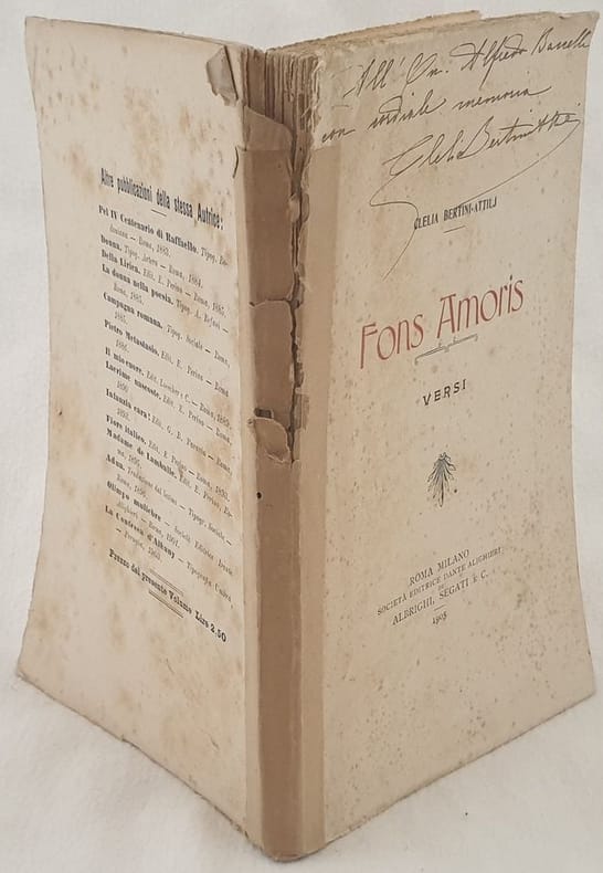 Prima edizione del 1905 di questa raccolta di versi di Clelia Bertini Attilj. Una poesia dedicata all'Umbria, ad Annita Garibaldi, Ai fratelli di Romania, Per Teresa Gnoli Gualandi, Colombo, Sordello, Cola di Rienzo, Pel centenario di Domenico Cimarosa, in morte di Armida Cielo ecc... Dedica con firma dell'autrice in copertina. In discrete condizioni. Copertina editoriale in discrete condizioni generali con usure ai margini e dorso coperto da carta. Legatura in discrete condizioni con rotture. Pagine in ottime condizioni generali con rare fioriture. In 8. Dim. 19,5x12 cm. Pp. 162+(1).First edition of 1905 of this collection of verses by Clelia Bertini Attilj. A pome dedicated to Umbria, ad Annita Garibaldi, Ai fratelli di Romania, Per Teresa Gnoli Gualandi, Colombo, Sordello, Cola di Rienzo, Pel centenario di Domenico Cimarosa, in morte di Armida Cielo ecc... Dedication with signature of the author in the title page. In fair conditions. Editorial cover in fair conditions lightly worn in the extremities awith spine covered by paper. Binding in fair general conditions with cracks. Inside pages are in very good conditions with occasional foxing. In 8. Dim. 19,5x12 cm. Pp. 162+(1)