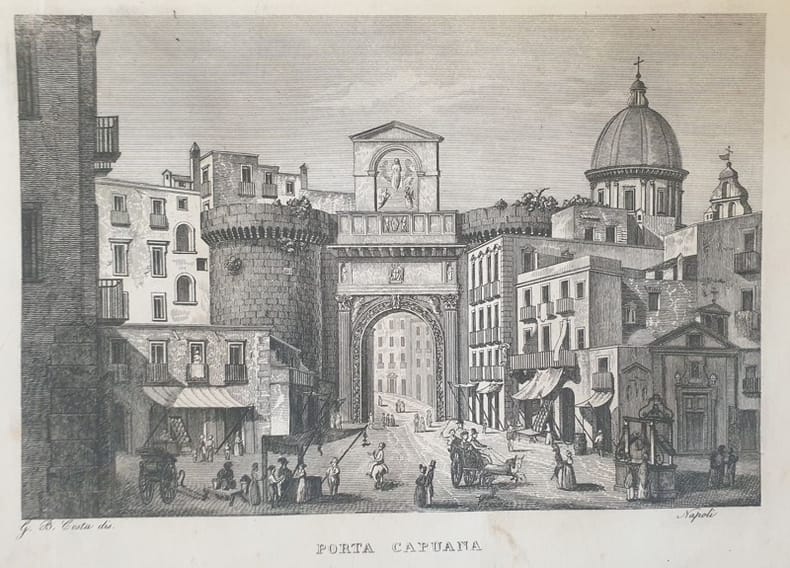 Veduta animata di Porta Capuana a Napoli del 1870 circa. AUTORE: Giovanni Battista Costa TECNICA: Acquaforte DIMENSIONI FOGLIO: cm 17,5x22,5<BR>DIMENSIONI INCISIONE: cm 12,5x18,5<BR>EPOCA: 1870 circa <BR>CONDIZIONI: Buone. Fioriture Veduta animata di Porta Capuana a Napoli del 1870 circa. AUTHOR: Giovanni Battista Costa TECHNIQUE: Etching LEAF DIMENSION: cm 17,5x22,5<BR>ENGRAVING DIMENSION: cm 12,5x18,5<BR> DATE: 1870 circa CONDITIONS:Good conditions. Foxing
