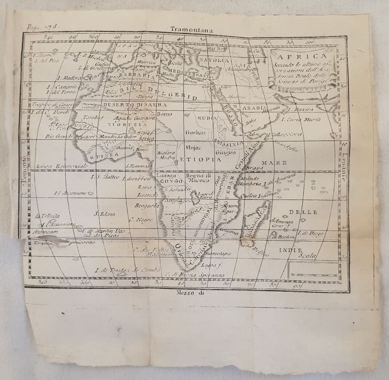 Graziosa mappa del 1750 circa della Africa. ATLANTE: Geografia universale - Buffier<BR>DIMENSIONI FOGLIO: cm 19x20,5 DIMENSIONI INCISIONE: cm 14x17,5<BR>EPOCA: 1750 circa CONDIZIONI: Ottime. Piegature. Piccolo strappo al margine inferiore sinistroNice map of 1750 circa of Africa ATLAS: Geografia universale - Buffier LEAF DIMENSION: cm 19x20,5 ENGRAVING DIMENSION: cm 14x17,5 DATE: 1750 circa CONDITIONS:Very good conditions. Foldings. Little tear in the lower right corner<BR><BR>