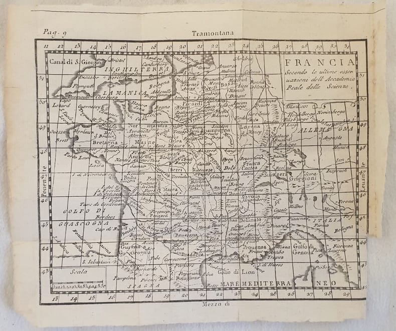Graziosa mappa del 1750 circa della Francia. ATLANTE: Geografia universale - Buffier DIMENSIONI FOGLIO: cm 17x20,5 DIMENSIONI INCISIONE: cm 14x17,5 EPOCA: 1750 circa CONDIZIONI: Ottime. Piegature. Nice map of 1750 circa of Francia ATLAS: Geografia universale - Buffier LEAF DIMENSION: cm 17x20,5 ENGRAVING DIMENSION: cm 14x17,5 DATE: 1750 circa CONDITIONS:Very good conditions. Foldings.