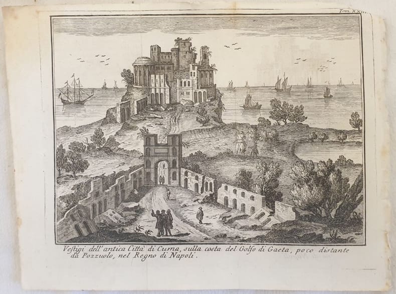 Veduta dei resti archeologici dell'antica città di Cuma, tra Bacoli e Pozzuoli. Atlante: Lo stato presente di tutti i popoli del mondo 1737-50 Data: 1750 circa Tecnica: incisione su rame Dimensione del foglio: 19x24 cm Dimensione incisione: 15x20,5 cm Condizioni: Buone. Alcune fioriture. View of the archeological city of Cuma between Bacoli and Pozzuoli. Atlas: Lo stato presente di tutti i popoli del mondo 1737-50 Date: 1750 circa Technique: Copper etching Leaf Dimension:19x24 cm Engraving Dimension: 15x20,5 cm Conditions: Good conditions. Some foxing.
