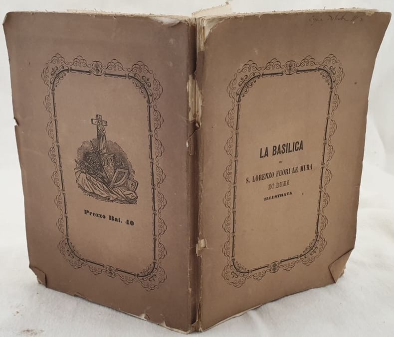 Edizione originale del 1861 di questa pubblicazione storica scritta da Salvatore da Morrovalle Cappuccino. L'opera è un saggio sull'origine e storia del Campo Verano a Roma con particolare riferimento alla Basilica di San Lorenzo fuori le Mura. Tra gli argomenti trattati: Arti e usi dei cristiani primitivi, Catacombe Laurenziane, San Lorenzo edificata per ordinee di Costantino Magno, I restauri di Pelagio, Portico, Interno della Chiesa, Sacrestia, Monastero ecc... Appendice di Tito Bollici sul Campo Santo. In buone condizioni. Copertina editoriale in discrete condizioni generali con usure e mancanze al dorso. Legatura in buone condizioni. Pagine in buone condizioni con rare fioriture. In 8. cm 20,5x14. Pp. 157+(2).Original edition of 1861 of this historical pamphlet written by Salvatore da Morrovalle Cappuccino. The work is an essay about the origin and history of Campo Verano in Rome with particular refeering to the Basilica di San Lorenzo fuori le Mura. The issues treated: Arts and usages of primitive christians, Catacombe Laurenziane, San Lorenzo edificata per ordinee di Costantino Magno, Restauration of Pelagio, Portico, Interno della Chiesa, Sacrestia, Monastero ecc... Appendix by Tito Bollici about cemetery. In good conditions. Editorial cover in fair conditions with wearings and tears in the spine. Binding in good conditions. Pages in good conditions with occasional foxing. In 8. cm 20,5x14. Pp. 157+(2).<BR><BR>