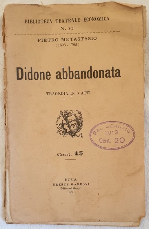 Edizione del 1908 della tragedia "Didone abbandonata" del poeta, librettista, drammaturgo Pietro Metastasio (1698-1782) pseudonimo di Pietro Antonio Domenico Bonaventura Trapassi della collana "Biblioteca teatrale economica". Brossura editoriale. In discrete condizioni. Brossura editoriale in discrete condizioni generali con lievi usure ai margini e dorso Legatura quasi assente. All'interno le pagine si presentano in buone condizioni con rare fioriture. In 16. 17,5x11 cm. Pp. 52+(4).Edition of 1908 of the series Biblioteca teatrale economica of this drama by the poet, booklet writer, dramawriter Pietro Metastasio (1698-1782) pseudonymous of Pietro Antonio Domenico Bonaventura Trapassi. In fair conditions. Editorial cover in fair general conditions lightly worn in the extremities. Binding almost lacks. Inside pages are in good conditions with occasional foxing. In 16. 17,5x11 cm. Pp. 52+(4).