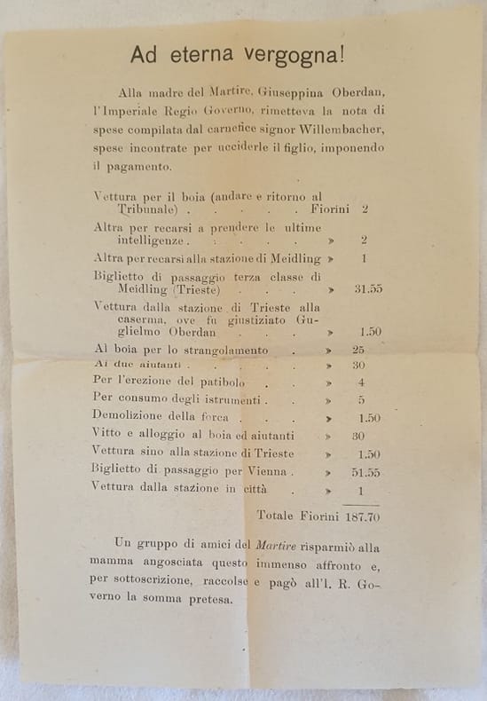 Volantino originale della fine dell'ottocento, la lista delle spese sostenute per l'uccisione del patriota irredentista Guglielmo Oberdan (1858-1882). L'elenco delle spese venne inviata alla madre Giuseppina Oberdan dal boia Willembacher. Questo volantino è stato scritto e diffuso da un gruppo di amici e simpatizzanti del martir In ottime condizioni. Piegature In 8. Dim. cm 24,5x17,5. Original poster of the end of 19th century, the list of expenses held for the murdering of patriot Guglielmo Oberdan (1858-1882). The list of expenses was sent to his mother Giuseppina Oberdan byt he murderer Willembacher. This poster has been written and spread bya group of friends of marty In very good conditions. Foldings In 8. Dim. cm 24,5x17,5. <BR><BR>