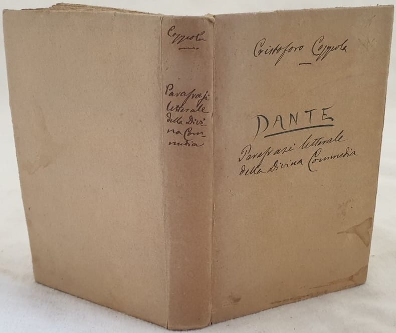 Edizione del 1855 di questa parafrasi letterale della Divina Commedia di Dante Alighieri a cura del Sacerdote Cristoforo Coppola. Alcune annotazioni a matita. In discrete condizioni ma completo. Copertina assente. L'occhietto è stato incollato a un rinforzo di cartone. Copertina morbida di protezione con note manoscritte. Legatura in mediocri condizioni con rotture. Pagine in buone condizioni con fioriture. In barbe. In 16. cm 16x10,5. Pp. (9)+13-446+(1).Edition of 1855 of this litteral paraprasis od Divina Commedia by Dante Alighieri a cura del Sacerdote Cristoforo Coppola. Some notes with pencil. In fair conditions but complete. Cover lacks. The false title page has been attached to a reinforcement of carton.. Soft cover of protection with handwritten notes. Binding in poor conditions with light cracks. Pages in good conditions with foxing. Uncut copy. In 16. cm 16x10,5. Pp. (9)+13-446+(1).