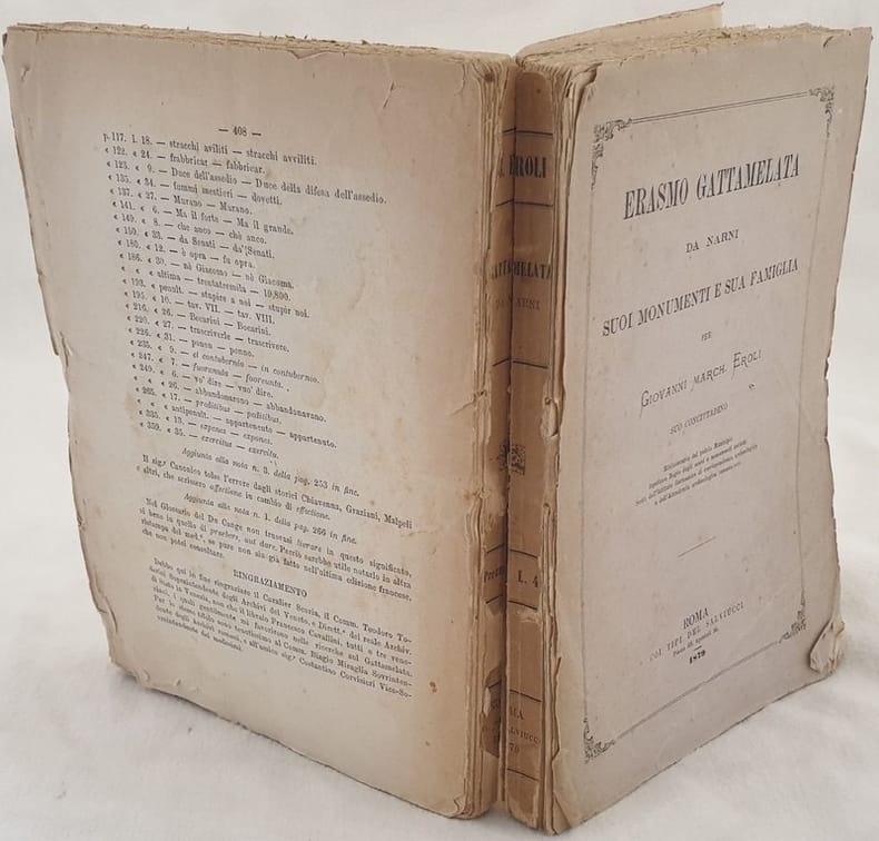 Prima edizione del 1879 di questa pubblicazione storica sul condottiero e capitano di ventura Erasmo Stefano da Narni detto il Gattamelata (1370 Narni - 1443 Padova) scritto dal Marchese Giovanni Eroli. All'interno sono presenti 10 tavole coperte da carta velina, la tavola in antiporta è il ritratto del Gattamelata nella Galleria Pitti in Firenze. Insieme al volume due pagine di introduzione all'opera con l'indicazione che lo stesso viene venduto presso l'autore stesso a Narni e che l'incasso era a beneficio dei poveri. Prezzo 10 lire. Dedica alla prima carta bianca dell'autore al religioso studioso di Dante Agostino Bartolini (1839-1916) con firma di Eroli.In discrete condizioni ma completo. Copertina editoriale in buone condizioni generali con lievi usure ai margini e dorso. Piatto anteriore staccato e posteriore assente. Legatura in discrete condizioni con lievi rotture. Pagine in buone condizioni con fioriture. Alcune piegature agli angoli. In barbe. In 8. cm 22,5x15,5. Pp. XII+408.First edition of 1879 of this historical pamphlet about the captain Erasmo Stefano da Narni known as Gattamelata (1370 Narni - 1443 Padova) written by Marchese Giovanni Eroli. Inside there are 10 plates covered by tissue paper, the plate in the frontspice is the portrait of Gattamelata in Galleria Pitti in Florence. Together with the volume two pages of introduction to the work with indication that the same volume is sold by the author in Narni and that the sum was for poor people. Price 10 lire. Dedication to the first blank page of the author to the scholar of Dante Agostino Bartolini (1839-1916) signed by Eroli. In fair conditions but complete. Editorial cover in good conditions lighworn in the extremities. Front plate is detached and back plate lacks. Binding in fair conditions with light cracks. Pages in good conditions with foxing. Some foldings in the corners. Uncut copy. In 8. cm 22,5x15,5. Pp. XII+408.
