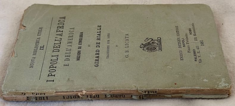 Interessante studio di etnografia del 1881 sui popoli dell'Africa e dell'America di Girard de Rialle. Traduzione di G. B. Licata. All'interno: Teorie sull'origine dell'uomo, classificazione delle razze umane, Popoli dell'Africa (Boschimani, Akkà, Ottentoti, Neri, Cafri o Bantù, Puli, Nubiani) I popoli dell'America (Pellirosse o tribù selvagge dell'America del Nord, Caraibi, Tupi Guarani, Pampa, Charrua, Puelchi, Teuelchi, Fuegiani, Quichua Aymara, Cibcha o Muysca, Maya Quichè, Nahua, Eschimesi ecc... In discrete condizioni. Copertina editoriale in discrete condizioni generali con lievi usure ai margini e dorso. Legatura in discrete condizioni con qualche lieve rottura. Pagine in buone condizioni con fioriture. In 16. cm 16x10,5. Pp. 174. Interesting study of ethnography of 1881 about people of Africa and America by Girard de Rialle. Translation by G. B. Licata. Inside: Theories about the origin of man, classification of human races, People of Africa (Boschimani, Akkà, Ottentoti, Neri, Cafri o Bantù, Puli, Nubiani) I popoli dell'America (Pellirosse o tribù selvagge dell'America del Nord, Caraibi, Tupi Guarani, Pampa, Charrua, Puelchi, Teuelchi, Fuegiani, Quichua Aymara, Cibcha o Muysca, Maya Quichè, Nahua, Eschimesi ecc... In fair conditio Editorial cover in fair conditions lightly worn in the extremities. Binding in fair conditions but with some light crack. Pages in good conditions with foxing. In 16. cm 16x10,5. Pp. 174.