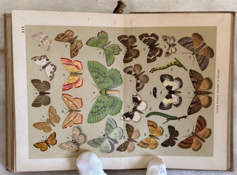 Edizione del 1912 di questo manuale Hoepli sulle farfalle scritto da Angelo Senna. Alla fine del volume sono presenti 24 finissime tavole doppie in cromolitografia che mostrano numerose specie di farfalle. Firma alla prima pagina di sguardia datata 1924 e al frontespizio. Alla fine pubblicità Hoepli. In discrete condizioni. Copertina in tela editoriale in discrete condizioni generali con lievi usure ai margini e dorso. Legatura in mediocri condizioni con rotture. Pagine in buone condizioni con rare fioriture. Usure e parti mancanti alla planche XIII. In 16. cm 15,5x11. Pp. (6)+724. Edition of 1912 of this Hoepli manual about butterflies written by Angelo Senna. At the end of the volume there are 24 very fine chromolithography plates featuring different species of butterflies. Signature in the first endpage dated 1924 and in the title page. at the end advertisings of Hoepli manuals. In fair conditions. Cloth editorial cover in fair conditions lightly worn in the extremities. Binding in poor conditions with cracks. Pages in good conditions with occasional foxing. Wearings and lackings in plate XIII. In 16. cm 15,5x11. Pp. (6)+724
