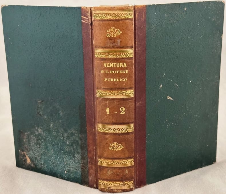 Edizione del 1859 di questa opera del Padre Gioacchino Ventura (1792-1861) gesuita, figlio di Paolo Ventura Barone di Raulica. Ventura, nato a Palermo sostenne la Rivoluzione siciliana del 12 Gennaio 1848 e venne nominato ministro plenipotenziario e commissario straordinario a Roma, dove rimase per difendere la causa siciliana. Gli argomenti dei suoi scritti variano dalla politica alla religione. L'opera è composta da due tomi in un unico volume ed è completa. Lo scritto a continuazione dell'opera "Il potere politico cristiano" è un saggio sul potere pubblico. All'interno: Società e potere in generale, Fine della società e necessità del cattolicismo, Della società pubblica in particOlare e dei vari stati in cui può trovarsi, Potere pubblico in particolare, Dignità e origine divina del potere pubblico, Dell'origine immediata e diretta del potere pubblico, Risposta alle obiezioni dei pubblicisti assolutisti contro la dottrina del diritto della società di trasmettere la sovranità, Sul diritto della cosietà perfetta di resistere, Confutazione delle obbiezioni dei pubblicisti regi contro il diritto della società di resistere attivamente al Potere, Legittimità ed usurpazione, Rapporti tra il potere pubblico e dimestico e diritto d'elezione, Ancora dei rapporti del potere colla patria potestà, Attribuzione del potere pubblico ingiustizia e pericoli della centralizzazione ecc... In ottime condizioni. Copertina in mezza pelle coeva con titolo e ricche decorazioni in oro al dorso in ottime condizioni generali con lievi usure ai margini e dorso. Legatura in buone condizioni. Pagine in buone condizioni con fioriture. In 8. cm 19x12,5. Pp. 701+(1). Edition of 1853 of this work by the father Gioacchino Ventura (1792-1861) a jesuit, son of Paolo Ventura Baron of Raulica. Ventura, was born in Palermo and supported the Sicilian revolution of January 12, 1848, and was named minister plenipotentiary and extraordinary commissioner to Rome by the new government, where he stayed to substain the Sicilian cause. The issues of his writings vary from politics to religion. The work is amde up of two tomes in a unique tome and it is complete. The writing is a continuation of the work "Il potere politico cristiano", an essay about the public power. In very good conditions Half leather coeval cover with righ gilted title and decorations in the spine in very good conditions lightly worn in the extremities. Binding in good conditions. Pages in good conditions with foxing. In 8. cm 19x12,5. Pp. 701+(1).