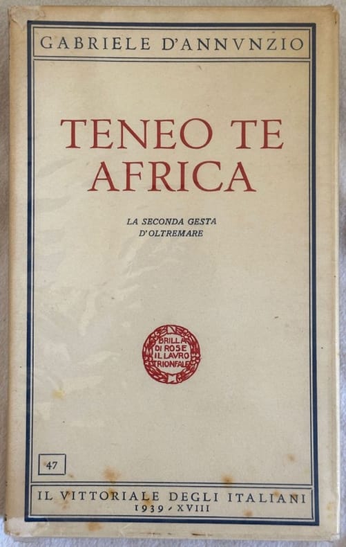 Edizione del 1939 del romanzo "Teneo te Africa" dello scrittore, poeta, drammaturgo, politico e giornalista Gabriele D'Annunzio (1863-1938). Volume n. 47 della collana edita dalla fondazione "Il Vittoriale degli italiani". In ottime condizioni. Brossura editoriale in ottime condizioni generali con lievi usure ai margini e dorso. Pellicola protettiva con strappi e mancanze. Legatura in buone condizioni. All'interno le pagine si presentano in ottime condizioni con rare fioriture. In 8. Dim. 20,5x13 cm. Pp. 207.Edition of 1939 of the novel "Teneo te Africa" by the writer poet dramawriter politician and journalist Gabriele D'Annunzio (1863-1938). Volume n. 47 of the series edited by the fondation "Il Vittoriale degli italiani". In very good conditions. Editorial cover in very good general conditions slightly worn in the extremities. Binding in good conditions. Inside pages are in very good conditions with occasional foxing. In 8. Dim. 20,5x13 cm. Pp. 207.