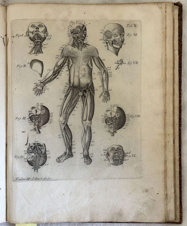Rarissima opera di anatomia ad uso degli studenti di chirurgia del nosocomio di San Pietroburgo scritto dal chirurgo e anatomista Abraham Chovet (1704-1790). Senza data ma del 1744 come si evince dalla prefazione. Numerose tabelle all'inizio. Seguono ventisei finissime tavole anatomiche fuori testo. Molto raro, nessuna copia censita. In discrete condizioni. Copertina in mezza pelle settecentesca con titolo a secco al dorso in buone condizioni generali con lievi usure marginali. Legatura in discrete condizioni con lievi rotture. Pagine in buone condizioni con fioriture. Angolo destro mancante ma restaurato a pag. 7 e tavola 1. Lievi gore d'umidità marginali. Restauro al margine superiore di pag. 2. Piccola galleria di tarlo al margine di piegatura da pag. 39 alla fine. In 8. cm 26,5x20,5. Pp. 69+3+(26) pl.. Peso Kg. 0,700 Very scarce work of anatomy for the usage of students of surgery of the University of Saint Petersburg written by tje surgeon and anatomist Abraham Chovet (1704-1790). Not dated but of 1744 as indicated in the prefation. Different charts at the beginning. Then 26 very fine anatomical plates at the end. Very scarce copy, no one has been registered. In fair conditions. Half leather cover of 18th century with embossed title in the spine in good conditions lightly worn in the extremities. Binding in fair conditions with light cracks. Pages in good conditions with foxing. Lower right corner lacks but has been restored in pag. 7 and plate 1. Light dump stains in the edges. Restauration in the upper edge of pag. 2. Little worming in the folding edge from pag. 39 to the end. In 8. cm 26,5x20,5. Pp. 69+3+(26) pl.. Weight Kg. 0,700