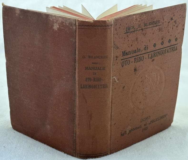 Edizione del 1915 di questo manuale di otorino laringoiatria di Guglielmo Bilancioni. All'interno 100 figure nel testo. Note manoscritte. In buone condizioni. Copertina in tela editoriale con titolo al dorso e piatto anteriore in buone condizioni con lievi usure marginali. Legatura in buone condizioni. Pagine in buone condizioni generali con fioriture. In 16. Dim. 15x11 cm. Pp. XI+928.Edition of 1915 of this manual of otolaryngologist by Guglielmo Bilancioni. Inside there are 100 figures in the text. Handwritten notes. In good conditions. Cloth editorial cover with title in the spine and front plate in good conditions lightly worn in the extremities. Binding in good general conditions.Inside pages are in good conditions with foxing. In 16. Dim. 15x11 cm. Pp. XI+928.<BR><BR>