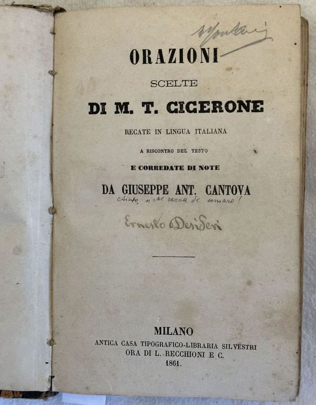 Edizione del 1861 di questa raccolta di orazioni scelte di Marco Tullio Cicerone. Traduzione con note a cura di Giuseppe Ant. Cantova. Antica nota manoscrita al frontespizio: "Aiuto si che razza di somaro!". In buone condizioni. Copertina in mezza tela in mediocri condizioni con usure e mancanze marginali. Legatura in discrete condizioni con lievi rotture. Pagine in buone condizioni generali con fioriture. In 16. Dim. 17x11 cm. Pp. 389+(3).Edition of 1861 of this collection of orations byi Marco Tullio Cicerone. Translation with notes by Giuseppe Ant. Cantova. Antique handwritten notes in the title page: "Aiuto si che razza di somaro!". In good conditions. Half cloth cover in poor conditions lightly worn in the extremities. Binding in fair conditions with light cracks. Inside pages are in good conditions with foxing. In 16. Dim. 17x11 cm. Pp. 389+(3).<BR><BR>