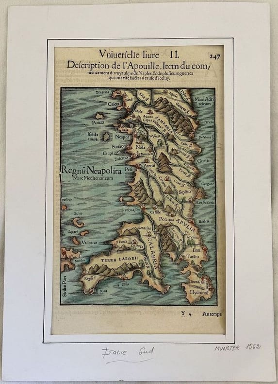Mappa originale del 1562 acquarellata a mano che mostra le seguenti regioni: Campania, Molise, Puglia, Basilicata e Calabria. L'incisione tratta dalla celebre opera "Cosmographia Universale, edizione francese del 1562. Al verso testo in francese. INCISIONE: Acquaforte su rame con coloritura coeva all'acquarello AUTORE: Sebastian Munster (1488-1552) ATLANTE: Cosmographia universale DIMENSIONI PASSEPARTOUT: cm 35x25 DIMENSIONI INCISIONE: cm 22x12,5 EPOCA: 1562 CONDIZIONI: buone condizioni Original map of 1562 colored by hand with aquarello featuring the following regions: Campania, Molise, Puglia, Basilicata and Calabria. The engraving is taken from the "Cosmographia Universale, french edition of 1562. In the verso text in french language. ENGRAVING: Copper etching with coeval colouring with acquarello painting AUTHOR: Sebastian Munster (1488-1552) ATLAS: Cosmographia universale SIZE OF PASSEPARTOUT: cm 35x25 SIZE OF THE ENGRAVING:cm 22x12,5 PERIOD: 1562 CONDITIONS: good conditions