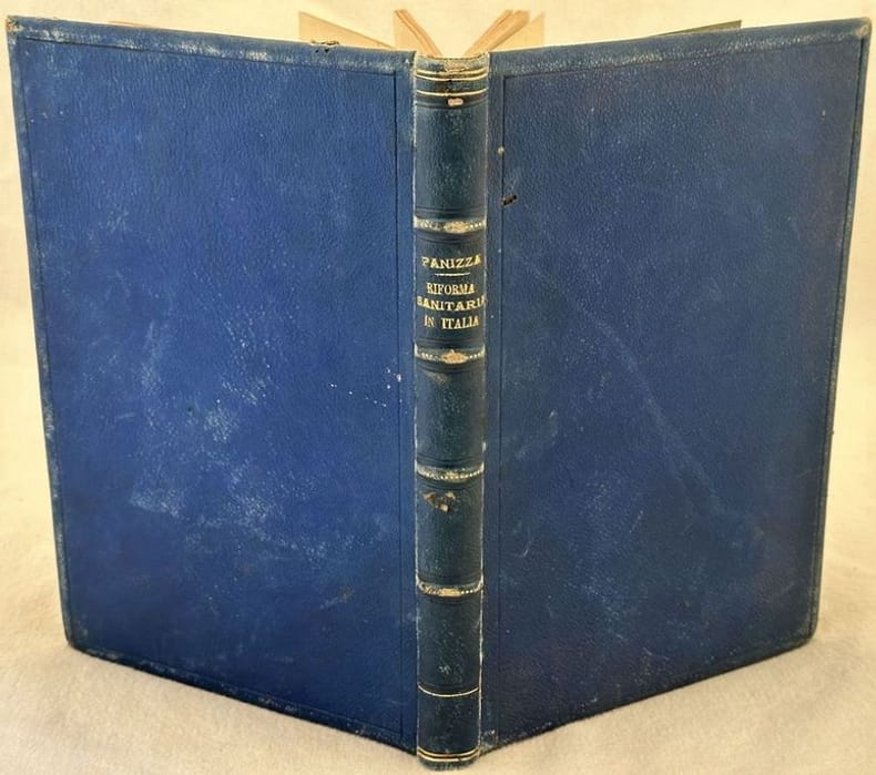 Rara opera del 1889 sulla riforma sanitaria in Italia scritto da Mario Panizza. All'interno: Discussione del bilancio dell'interno, Sul disegno di legge "tutela dell'igiene e della sanità pubblica", La riforma dell'amministrazione sanitaria in Italia, Sul disegno di legge "Tutela dell'igiene e della sanità pubblica", La salute pubblica e la questione sociale, Appendice: Testo della legge sulla tutela dell'igiene e della sanità pubblica. Alla fine tavola ripiegata: Morti di vaiolo per ogni 100000 abitanti. In buone condizioni. Copertina in mezza pelle con titolo in oro al dorso in buone condizioni generali con lievi usure ai margini e dorso. Legatura in buone condizioni. Pagine in buone condizioni con rare fioriture. Parte mancante al frontespizio. In 8. Dim. 23,5x16 cm. Pp. VIII+222+(1)+1 Tav. Scarce work of 1889 about health reformation in Italy by Mario Panizza. All'interno: Discussione del bilancio dell'interno, Sul disegno di legge "tutela dell'igiene e della sanità pubblica", La riforma dell'amministrazione sanitaria in Italia, Sul disegno di legge "Tutela dell'igiene e della sanità pubblica", La salute pubblica e la questione sociale, Appendice: Testo della legge sulla tutela dell'igiene e della sanità pubblica. At the end folded plate: Dead people of smallpox each 100000 inhabitants. In good conditions. Half leather cover with gilted title in the spine in good general conditions lightly worn in the extremities. Binding in good conditions. Inside pages are in good conditions with occasional foxing. Lacking in the title page. In 8. Dim. 23,5x16 cm. Pp. VIII+222+(1)+1 Tav. .