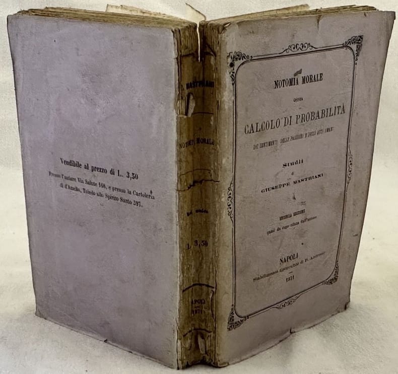 Seconda edizione del 1871 di questa opera di psicologia scritta da Giuseppe Mastriani (1816-1881) fratello di Francesco Mastriani autore di romanzi d'appendice. Mastriani fu scrittore e insegnante di lettere a Napoli. L'opera è in un volume ed è completa. L'autore descrive i vari tipi di carattere definendolo con relative passioni e sentimenti connaturali (Carattere in generale, apatisti, pigri, volubili, fermi, doppii e cupi, franchi, docili e deboli, buoni, carattere bizzarro..) I sentimenti (eroi, caritativi, amor patrio, giusti, maldicenti e adulatori, leali e perfidi, prudenti e furbi, coraggiosi, timore e speranza, umili e vili, pedichi e timidi,m pietosi e crudeli, rimorso e pentimento, emuli e invidiosi, divoti empii e ipocriti, allegri e malinconici, zotici urbani e ciarlieri, entusiasmo) Passioni (egoisti, ambiziosi, avari e prodighi, giuocatori, vendicativi e generosi, iracondi, tranquillità di spirito, I crapuloni e il convito, I lussuruosi e i molli, Dell'amore, gelosi, Della noia ecc... In buone condizioni. Copertina editoriale in discrete condizioni con lievi usure marginali. Piatto anteriore assente. Legatura in discrete condizioni con lievi rotture. Pagine in buone condizioni con rare fioriture. In 8. Dim. 19x12 cm. Pp. XXXIII+(1)+449 Second edition of 1871 of this work of psychology written by Giuseppe Mastriani (1816-1881) brother of Francesco MAstriani author of instalments novels.<BR><BR>Mastriani was writer and teacher of letters in Naples <BR><BR>The work is in one volume and it is complete.<BR><BR>The author describes different kind of carachters, feelings, passions ecc...<BR><BR>In good conditions. <BR>Editorial cover in fair conditions lightly worn in the extremities. Back plate lacks. Binding in fair conditions with some light cracks. Inside pages are in good conditions with occasional foxing. In 8. Dim. 19x12 cm. Pp. XXXIII+(1)+449.<BR><BR> <BR>