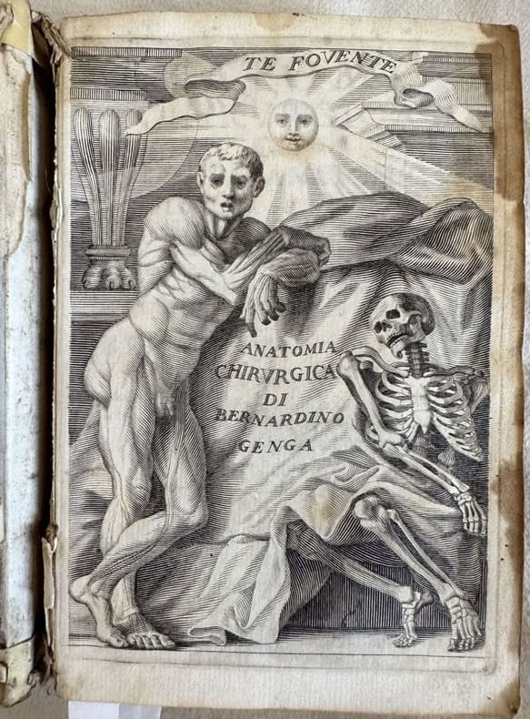 Prima edizione del 1672 di questa opera, una pietra miliare nel campo della chirurgia del medico e anatomista Bernardino Genga (Mondolfo 1620 - Roma 1690). Bernardino Genga (1620-1690), fu uno dei più celebri anatomisti e studiosi di medicina del seicento e uno dei massimi esperti delle opere di Ippocrate della sua epoca. Fu tra i primi ad esprimersi in favore dell'insegnamento della circolazione del sangue. Tra i suoi interessi grande rilievo ebbero la preparazione di preparati anatomici, nonché l'anatomia della scultura antica greca e romana. Nato a Mondolfo nel Ducato di Urbino praticò l'arte chirurgica presso l'Ospedale di Santo Spirito in Sassia. Nell'opera qui presentata Genga sottolinea l'importanza della conoscenza dell'anatomia umana da parte dei chirurghi indicando diverse tecniche chirurghe e descrivendo casi pratici anche nell'ambito della odontoiatria. "the first book devoted entirely to surgical anatomy" Rif. Garrison-Morton 384. Bella incisione in antiporta. Antiche note manoscritte all'ultima carta. In buone condizioni. Copertina in piena pergamena floscia coeva con titolo manoscritto al dorso in discrete condizioni generali con lievi usure ai margini e dorso. Macchie. Legatura in buone condizioni ma corpo del libro in parte staccato dalla legatura. Pagine in buone condizioni con fioriture. In 16. Dim. 16,5x11 cm. Pp. (13)+455+(3). First edition of 1672 of this work, a milestone in the field of surgery by the physician and anatomist Bernardino Genga (Mondolfo 1620 - Roma 1690). Bernardino Genga (1620-1690), was one of the most famous anatomists and scholar of meedicine of 17th century and one of the most important experts of works of Hyppocratis of his time. He understood the importance of teaching of circulation of blood. He was really interested about antique roman and greek sculptures. He was born in Mondolfo in Ducato di Urbino and practiced surgery in the Hospital of Santo Spirito in Sassia. In this work Genga underlines the improtance of human anatomy by surgeons indicating different surgical techniques and describing practical cases in the field of teeth care "the first book devoted entirely to surgical anatomy" Rif. Garrison-Morton 384. Beautiful engraving in the frontspice. Antique handwritten notes in the last page. In good conditions. Full parchment coeval cover with handwritten title in the spine in fair general conditions lightly worn in the extremities. Stains. Binding in good conditions but the body of the book partially detached from binding. Inside pages are in good conditions with foxing. In 16. Dim. 16,5x11 cm. Pp. (13)+455+(3).