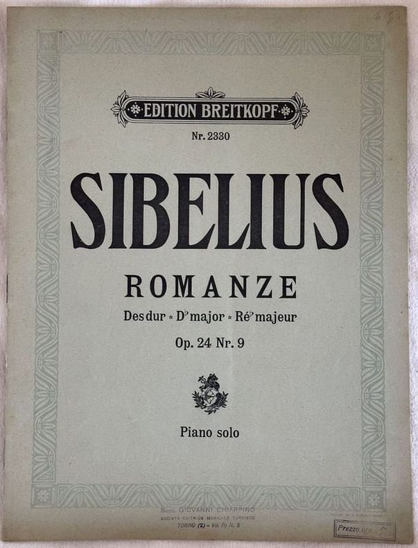 Edizione di inizio novecento di questa melodia per pianoforte "Romance" del compositore finlandese Jean Sibelius (1865-1957), dall'opera 24 n. 9. In buone condizioni. Copertina editoriale in buone condizioni con lievi usure marginali. Legatura in buone condizioni. Pagine in buone condizioni con rare fioriture. In folio. cm. 30,5x23. Pp. 7.Edition of early 20th century of this melody for piano "dyll" by the finnish composer Jean Sibelius (1865-1957), from the opera 24 n. 9. In good conditions. Editorial cover in good conditions with lightly worn in the extremities. Binding in good conditions. Pages in good conditions with occasional foxing.In folio. cm. 30,5x23. Pp. 7.