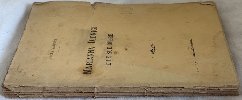 Prima edizione del 1896 di questa pubblicazione sulla pittrice Marianna Dionigi (Roma 1756- ivi 1826) scritto da Nicola Marcone. L'artista dipinse per lo più paesaggi romani, stampe e illustrazioni. Fu anche studiosa di archeologia e musicista (Rif. Treccani online). Ritratto della pittrice in antiporta. In discrete condizioni Copertina editoriale in discrete condizioni generali con lievi usure ai margini e dorso. Piatto posteriore assente. Legatura quasi assente. Pagine in buone condizioni con fioriture. Piccolo strappo all'incisione in antiporta. In 8. Dim. 21,5x13,5 cm. Pp. 111+(1). First edition of 1896 of this pamphlet about the painter Marianna Dionigi (Roma 1756- ivi 1826) written by Nicola Marcone. The artist painted mostly roman views, plates and illustrations. She was also scholar of archeology and musician (Rif. Treccani online) Portrait of the painter in the frontspice. In fair conditions. Editorial cover in fair general conditions lightly worn in the extremities. Back plate lacks. Binding almost missing. Inside pages are in good conditions with foxing. Little tear in the plate in the frontspice. In 8. Dim. 21,5x13,5 cm. Pp. 111+(1).