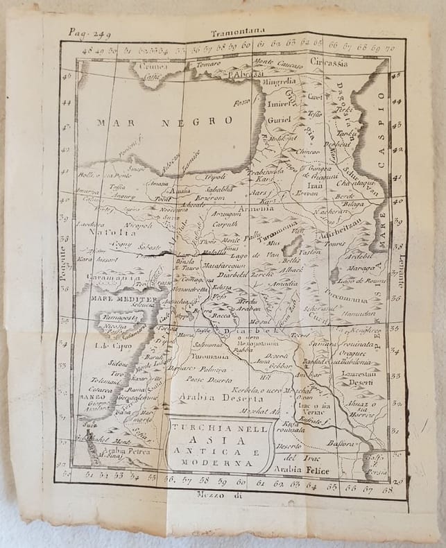 Graziosa mappa del 1750 circa della Turchia nell'Asia antica e moderna. ATLANTE: Geografia universale - Buffier DIMENSIONI FOGLIO: cm 20,5x18,5 DIMENSIONI INCISIONE: cm 18x14 EPOCA: 1750 circa CONDIZIONI: Buone. Piegature.Nice map of 1750 circa of America ATLAS: Geografia universale - Buffier LEAF DIMENSION: cm 20,5x18,5 ENGRAVING DIMENSION: cm 18x14 DATE: 1750 circa CONDITIONS:Good conditions. Foldings.